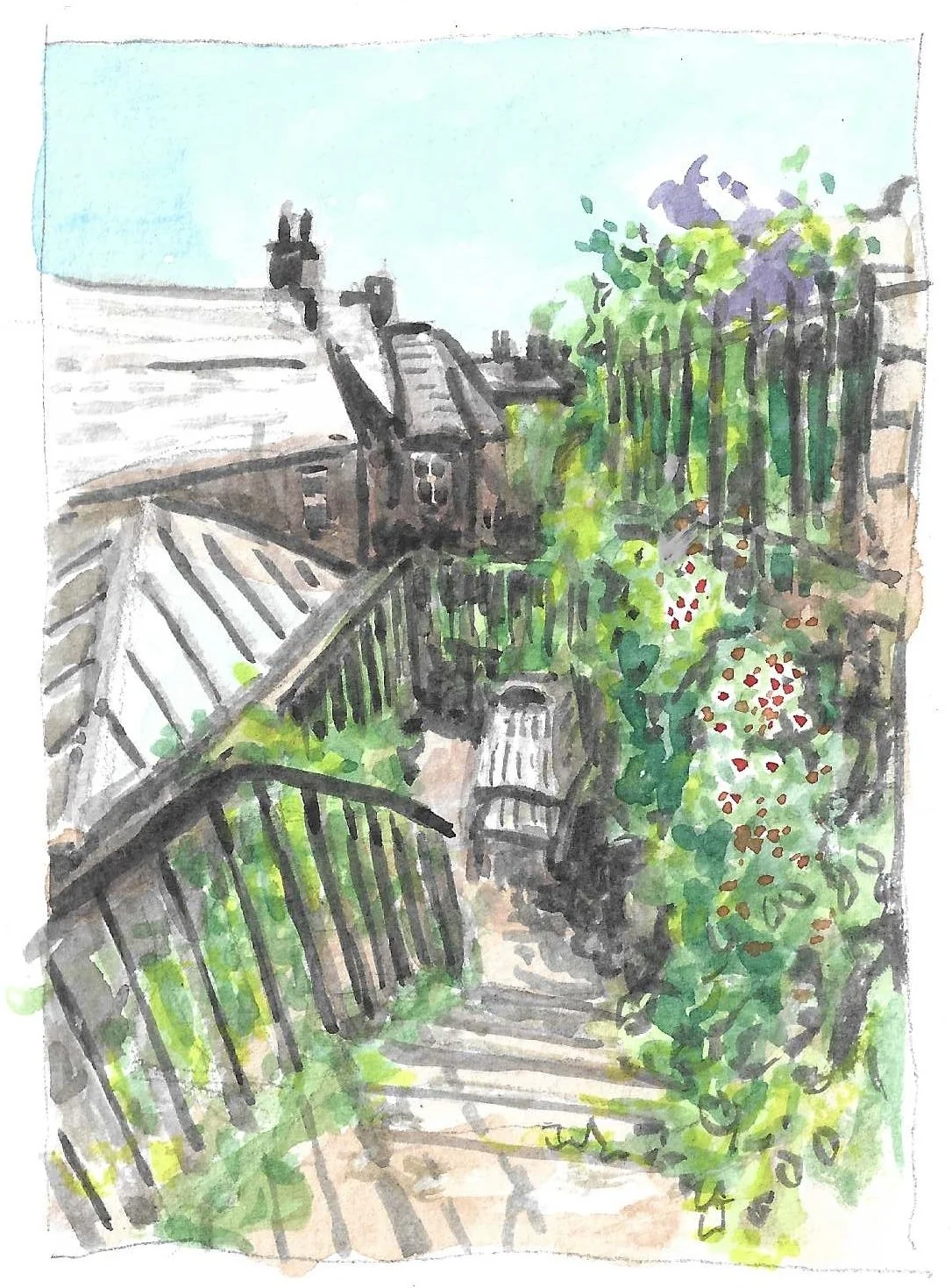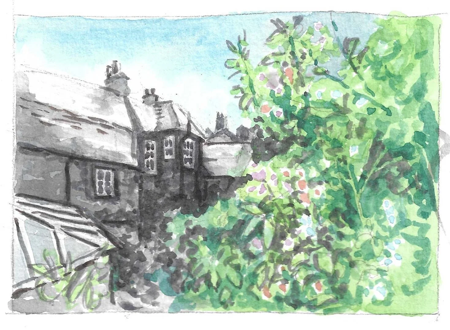 Initial sketches were made of the house in both pen and gouache. There were a lot of interesting things about this subject, especially the curved brick wall that gave an interesting sense of space to the scene.